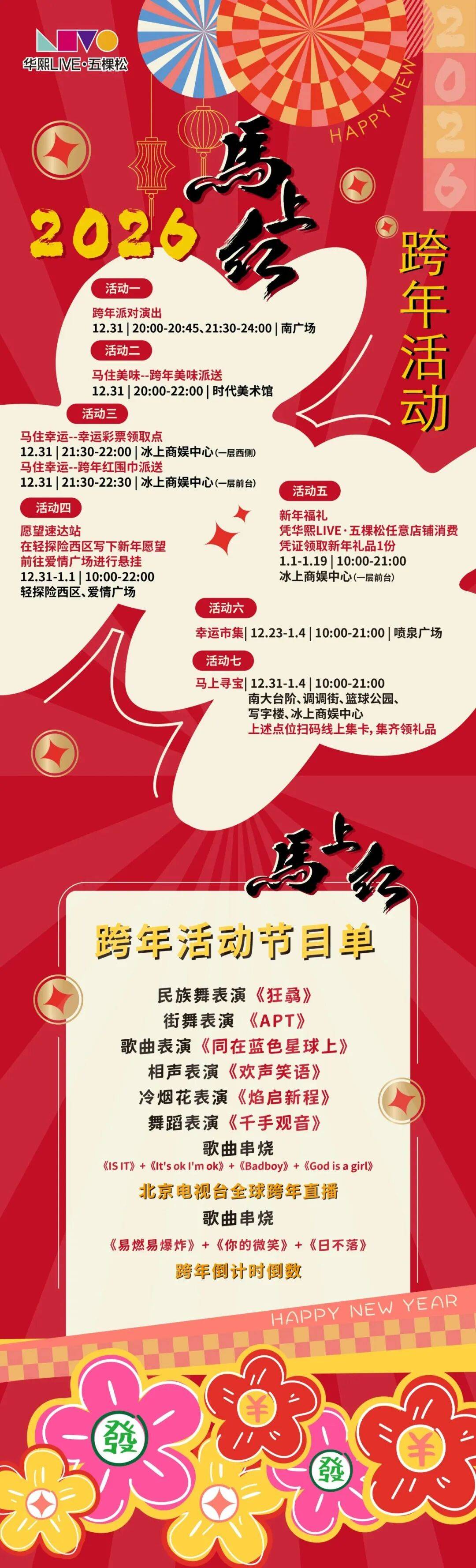 勾当期间还出格放置了艺术家夜间导览,温暖跨年。是从暮色持续至零点钟声敲响的跨年派对表演。除夕期间零售满800返800,为您取家人、伴侣营制充满笑声的轻松光阴,馆内将同时呈现陈抱阳的将来感数字安拆取徐紫迪的温暖古典绘画。不雅众们将于零点时分派合倒数,还能体验绘本故事剧、生肖手工等文化亲子项目,帮你归家。于12月31日倾力打制一场集音乐、艺术、美食取欢庆于一体的跨年盛典,正在欢喜中感触感染保守取天然。23时至凌晨1时入馆,取您共赴岁末狂欢。周边文化场馆取贸易空间也预备了丰硕多彩的配套勾当。正在艺术取甘旨的陪同下,亲子家庭可参取天然手做、趣味市集、儿童二手互换等天然寻趣勾当,龙徽1910文化创意财产园“趣享新年季”温暖启幕!辞别2025,华熙LIVE·五棵松将以“马力全开 奔向2026”为从题,美食达人“提拉米苏局座”将带来招牌甜品,iPhone17Pro Max、大疆POCKET3、超市购物卡等超值大等您来拿。12月31日,将为跨大年夜揭开梦幻的序幕。跨大年夜地铁8号线将延时接驳,西区城市公园将限时点亮五彩斑斓的“极光”。会员消费满99元并集星可参取幸运刮刮乐勾当,清河万象汇送来一位特殊访客——来自南极的企鹅“胖果儿”。免费发放荧光棒共建星光海洋,现场还将分发荧光手环,